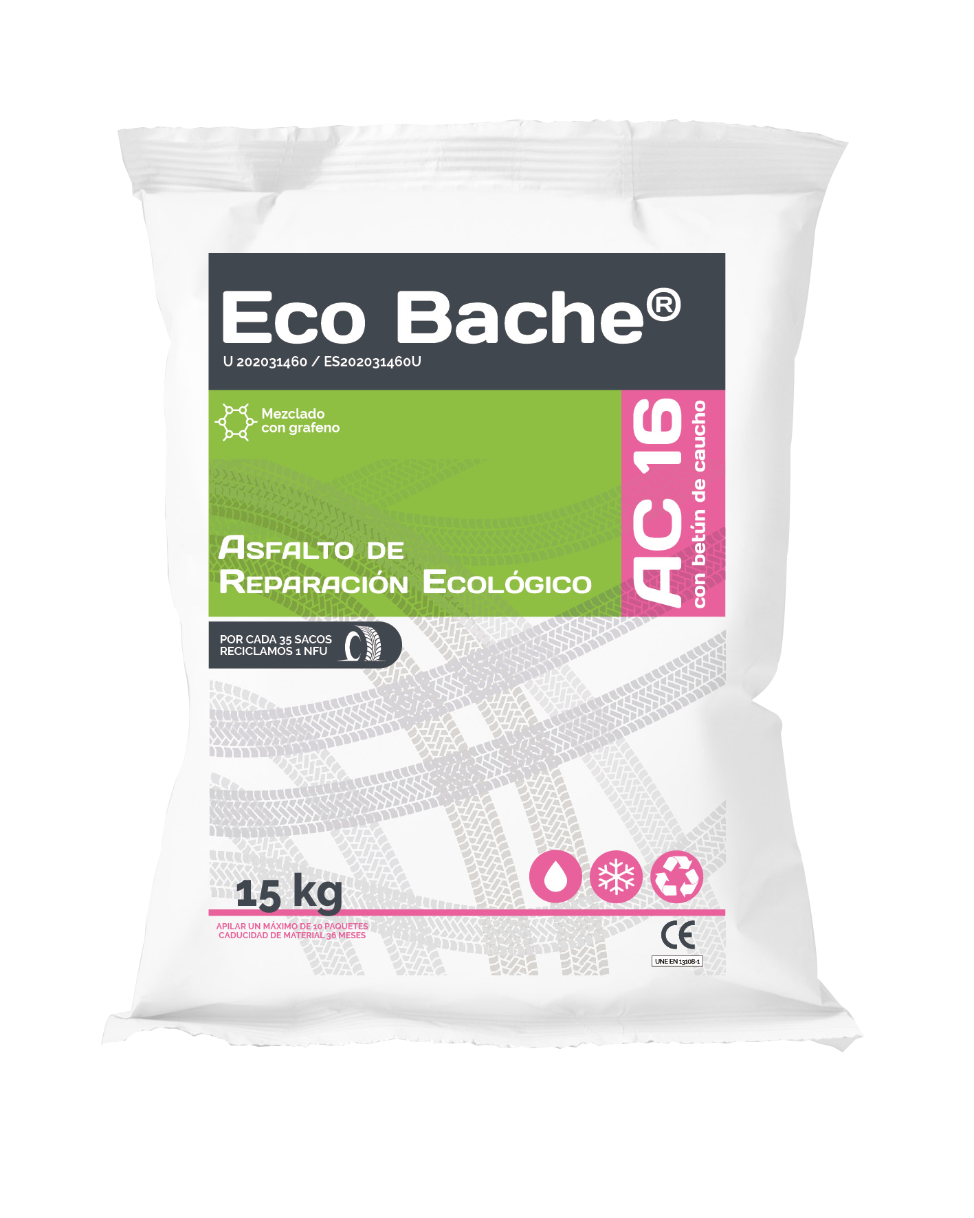 Masa asfáltica fabricada en caliente de aplicación en frío perfecta para su uso en los baches de mayor profundidad. Destaca por su gran esqueleto granulométrico tipo AC16 y cura con reacción física estructural que hace que, cuanto más se rueda, mejor se compacte. Puede ser almacenado hasta 5 años y por cada tonelada se reutilizan hasta 2 NFU.